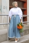 - Denim kumaştan üretilen eteğimizin uzunluğu ortalama 90 cm'dir. Beli tamamen lastikli ve iplidir. Bol kesim olan kiloş eteğimizin iki adet cebi bulunmaktadır ve uçları püsküllüdür.