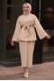 - Double krep kumaştan üretilmiştir. Üstünün boyu ortalama 70 cm, eteğin boyu ise ortalama 90 cm uzunluğundadır. Eteğinin beli lastiklidir. Giyim kolaylığı açısından sırt bölgesinden gizli fermuarlıdır. Kendi kumaşından seyyar kemerlidir.
