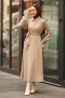 - Ürünümüz krem kaşkorse kumaştan üretilmiştir. Elbisemizin boyu ortalama 130cm uzunluğundadır. Elbisemiz düz kesim olup, ön kısmı yarım çıtçıt kapamalı ve taş detaylıdır. Yanlardan gizli cep detayı vardır. Kol manşetleri lastiklidir. Kendi kumaşından seyyar kemeri bulunmaktadır. Astarsızdır, iç göstermez. Günlük hayatta rahatlıkla kullanabilirsiniz.Özel günleriniz için tercih edebilirsiniz.