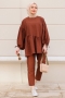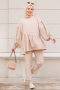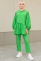 - Ürünümüz aerobin kumaştan üretilmiştir. Tunik boyu ortalama 75cm, pantolon boyu ortalama 95cm'dir. Tuniğimiz geniş kesim olup, etek kısmı asimetrik fırfır detaylı ve balon koldur. Kol manşetleri lastikli ve bağlamalıdır. Sırt kısmı gizli fermuarlıdır. Pantolonumuzun beli lastiklidir. İki adet cebi bulunmaktadır. Günlük hayatta rahatlıkla kullanabilirsiniz.